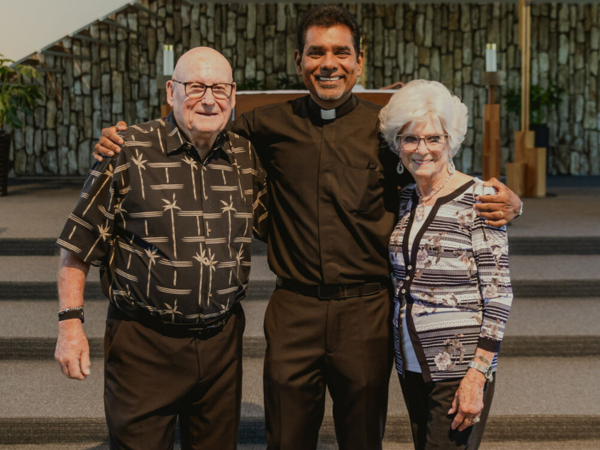 FR. ANGELOS SEBASTIAN JOINS LARRY AND JANE SPAULDING FOLLOWING THE DIOCESAN JUBILEE OF MARRIAGE MASS CELEBRATED ON JULY 26 IN THE ARBORETUM ON THE CHRIST CATHEDRAL CAMPUS. PHOTOS BY KAYLEE TOOLE/DIOCESE OF ORANGE