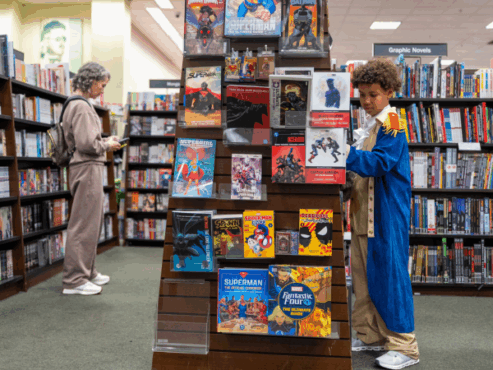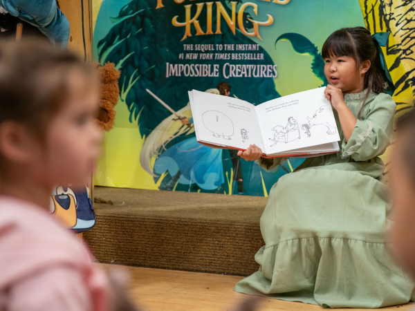 The children were seated on tiny wooden benches around the stage, some listening raptly and some clutching one of the many puppets for sale. Others started to flip through the new copies of Dog Man, which they hoped their parents would buy for them.