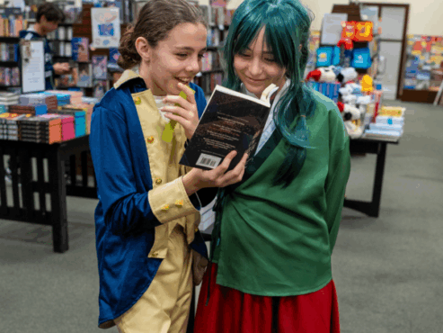 RHEA SIGALA, 11, LEFT, DRESSED AS HAMILTON AND LUNA RIOS-AGUILAR, 10, LEFT, DRESSED AS MAOMAO FROM THE APOTHECARY DIARIES, LOOK THROUGH A BOOK DURING THE ST. JULIANA SCHOOL BOOK FAIR. PHOTOS BY SCOTT SMELTZER/DIOCESE OF ORANGE