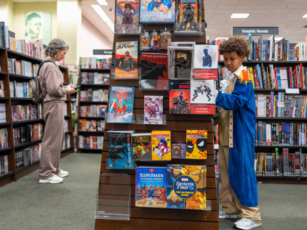Dressed as Eliza from Hamilton, Alaina De Leon, 8, took to the stage in a sage green dress made voluminous by the hoop skirts underneath to read Shel Silverstein’s Who Wants a Cheap Rhinoceros? A fan of the iconic children’s author, De Leon, who also read aloud last year, said she wasn’t nervous; she had read Silverstein’s book many times and felt comfortable at the bookstore surrounded by friends.