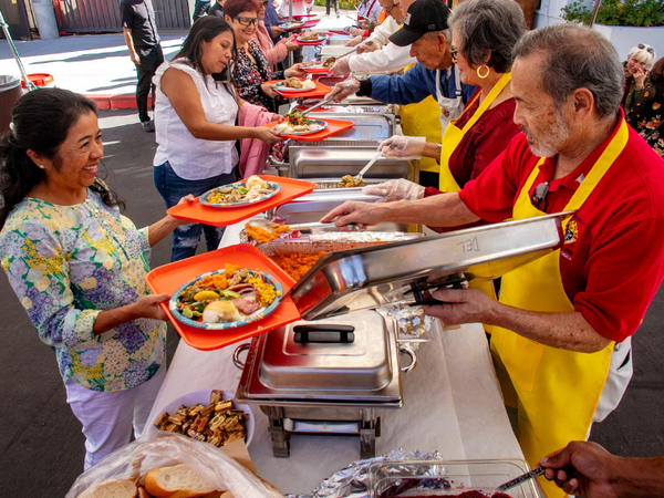 THANKSGIVING DINNER IS SERVED TO GUESTS ON THE PATIO AT ST. NICHOLAS CATHOLIC CHURCH IN LAGUNA WOODS. PHOTO BY SPENCER GRANT/DIOCESE OF ORANGE