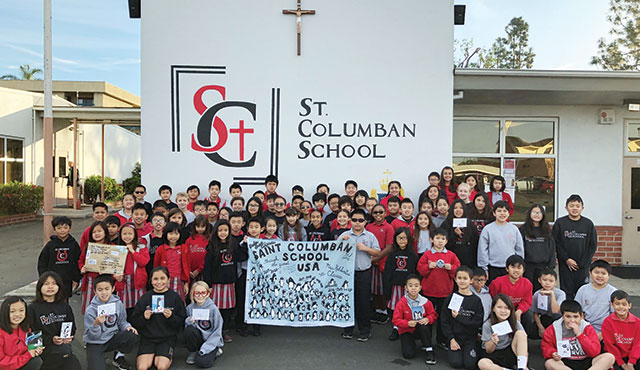 St. Columban School in Garden Grove presented a Christmas pageant to the community. The pageant was produced by the drama club and included students from preschool through eighth grade. Besides the pageant, the school community celebrated that their school flag has returned from Antarctica, where it flew for five days with a group of researchers that studied the Adelie penguins. Through Skype, St. Columban students witnessed the Adelieslaying on their eggs.