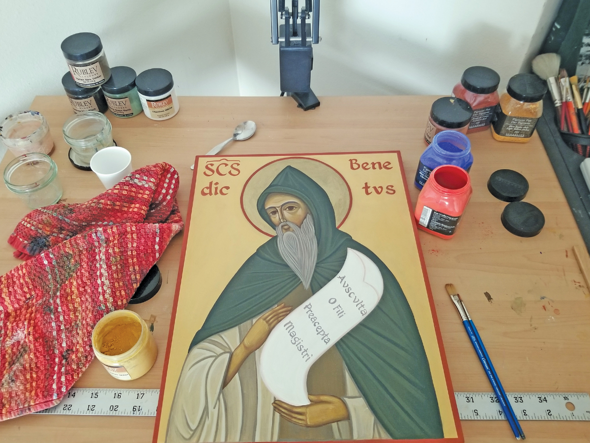 He is working on an icon of a little- known medieval Norbertie sister, St. Gertrude, the daughter of St. Elizabeth of Hungary. His hope is to continue depicting Norbertine saints; to date he has completed five such icons.