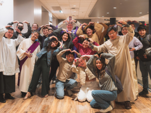 BISHOP TIMOTHY FREYER POSES WITH CLERGY AND UC IRVINE STUDENTS FOLLOWING A 2023 ASH WEDNESDAY MASS. PHOTO BY IAN TRAN/DIOCESE OF ORANGE