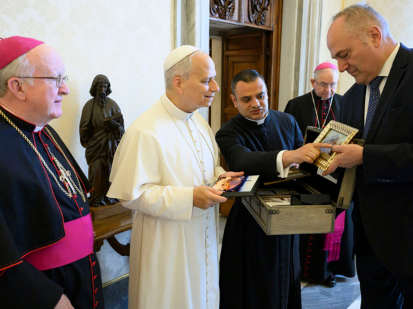 Bishop Vann, accompanied by Fr. David Moreno, the Bishop of Orange’s Priest Secretary and Master of Ceremonies, presented Pope Leo with a special gift box, prepared by Hispanic young people from Garden Grove.