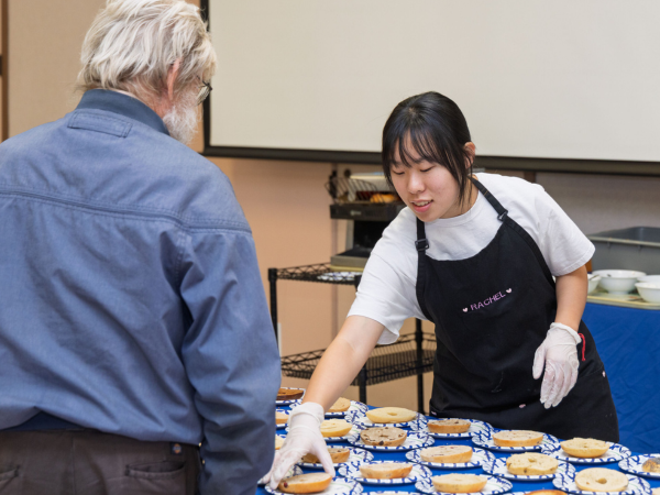 BREAD OF ANGELS’ RACHEL LIN, A STUDENT AT ST. ANGELA MERICI SCHOOL, SERVES BAGELS TO GUESTS. PHOTOS BY ALAN WENDELL/DIOCESE OF ORANGE