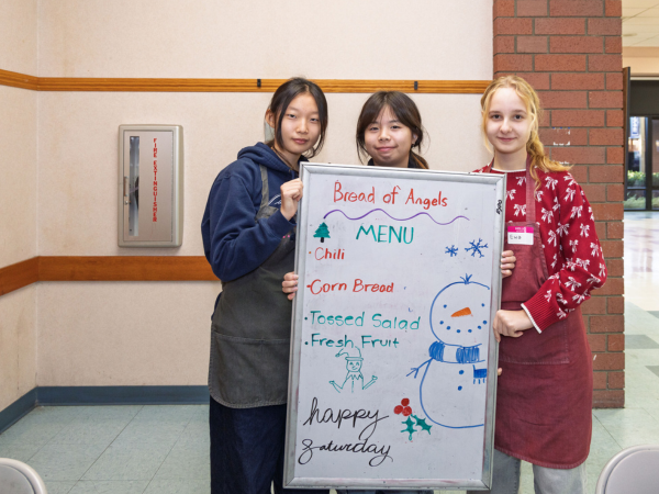 FROM LEFT: BREAD OF ANGELS’ SELENA PARK, KIARA SUN, AND EWA JANICK DISPLAY THE MENU FOR THE DAY.