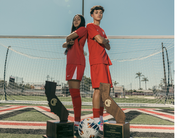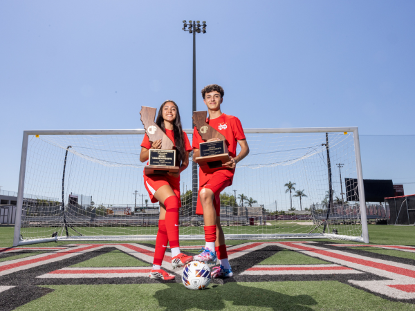 SIBLINGS JASMINE AND MARCEL AGUILAR STRIKE A POSE ON MATER DEI’S SOCCER FIELD. PHOTOS COURTESY OF MATER DEI HIGH SCHOOL