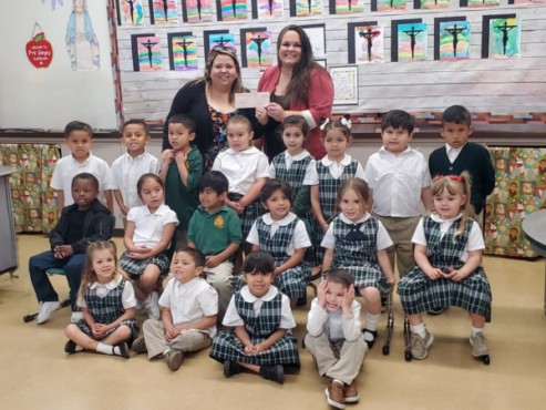 STUDENTS AND STAFF AT ST. JOSEPH CATHOLIC SCHOOL IN SANTA ANA, PART OF PAX CHRISTI ACADEMIES, ARE GRATEFUL FOR A GENEROUS TUITION ASSISTANCE DONATION DELIVERED BY KATHLEEN HURTT, OCF’S VICE PRESIDENT OF PHILANTHROPY & OPERATIONS.