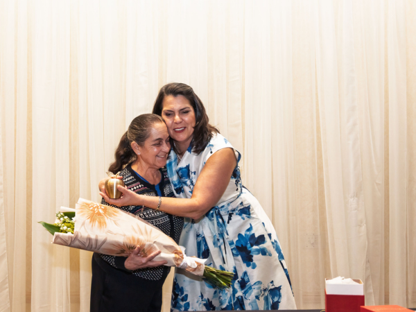 XENIA JESKE IS CONGRATULATED BY DR. ERIN BARISANO FOR HER 45 YEARS OF SERVICE DURING THE12TH ANNUAL CELEBRATING CATHOLIC SCHOOL EDUCATORS DINNER. PHOTOS BY ALAN WENDELL/DIOCESE OF ORANGE