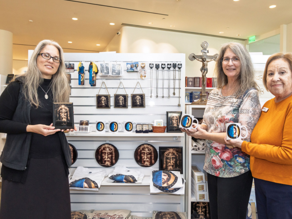 DANIELLE TAYABAS, LEFT, BETTY ARNOLD AND VIVIAN GOMEZ SHOWCASE SOME OF THE NEW ITEMS ON DISPLAY AT THE CHRIST CATHEDRAL SHOP, LOCATED NEAR THE ENTRANCE ON THE FIRST FLOOR OF THE RICHARD H. PICKUP CULTURAL CENTER ON THE CHRIST CATHEDRAL CAMPUS. PHOTOS BY ALAN WENDELL/DIOCESE OF ORANGE