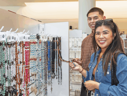 PAULETTE MASKERINO AND KYLE FARRO PAUSE FOR A PHOTO AS THEY BROWSE ROSARIES AT THE CHRIST CATHEDRAL SHOP.