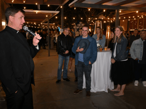 FR. JOHN MONEYPENNY, PASTOR OF OF ST. NORBERT CHURCH IN ORANGE, LEADS A PRAYER FOR THOSE ATTENDING THE CATHOLIC SCHOOL’S 60TH ANNIVERSARY FUNDRAISER. PHOTOS BY STEVEN GEORGES/DIOCESE OF ORANGE