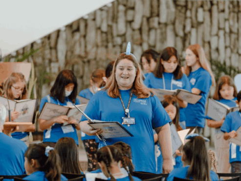 CATHEDRAL MUSIC ADMINISTRATOR LAUREN MCCAUL TENDS TO STUDENTS DURING THE CATHEDRAL CHOIR CAMP HELD IN JULY 2022. PHOTO BY KIERNAN COLIFLORES/DIOCESE OF ORANGE