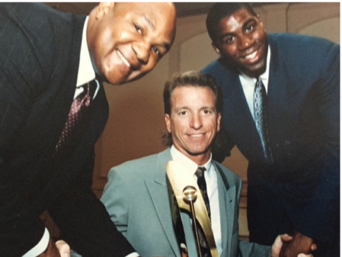 DAVID KILEY IS PICTURED WITH BOXING GREAT GEORGE FOREMAN AND LAKERS LEGEND IRVING MAGIC JOHNSON AFTER REVEINING THE MAGIC JOHNSON/JERRY BUSS HUMANITARIAN AWARD.