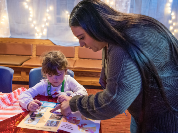 CATECHIST JOCELYN GRANADOS HELPS ARIANNA BERESFORD, 4, ON A LESSON DURING A SUNDAY PRESCHOOL CLASS.
