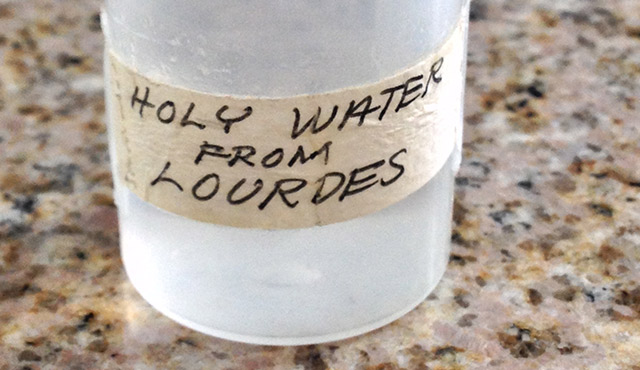 I have a tiny bottle of holy water, safely stored near the eggs in my refrigerator so it won’t topple over and spill. It has been there for years. In my father’s handwriting, the label taped to it reads: “Holy Water from Lourdes.” I find comfort knowing it is there, although we’ve had it for so long that no one in our family remembers how it came into our possession.