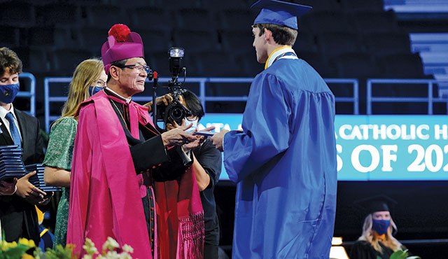 Santa Margarita Catholic High School’s class of 2021 had the rare opportunity to graduate on stage at The Honda Center, home of the Anaheim Ducks. The resilient 406 members of the class received their diplomas during the school’s 31st commencement ceremony on Friday, May 28. The Most Rev. Thanh Thai Nguyen, auxiliary bishop of the Diocese of Orange, presided over the ceremony. Superintendent of Schools, Erin Barisano, Ed. D., The Reverend Timothy Donovan, SMCHS Chaplain, and SMCHS President Andy Sulick joined Nguyen to reflect on the class’s achievements, perseverance and faith.