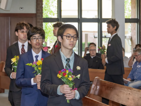 As part of an assignment, every eighth grader submitted an essay on what the May Crowning means to them, with one being selected to be read by that student during the ceremony. The winning essay, titled “Whispered Words, Woven Wreaths,” was written by eighth-grader Kameron Hodge, who described placing the crown of flowers atop Mary’s head as “a moment of connection, a reminder that we are not alone, that there is a Mother’s love — holy, divine and yet imperfect and human — that surrounds us in the soft glow of the candles.”