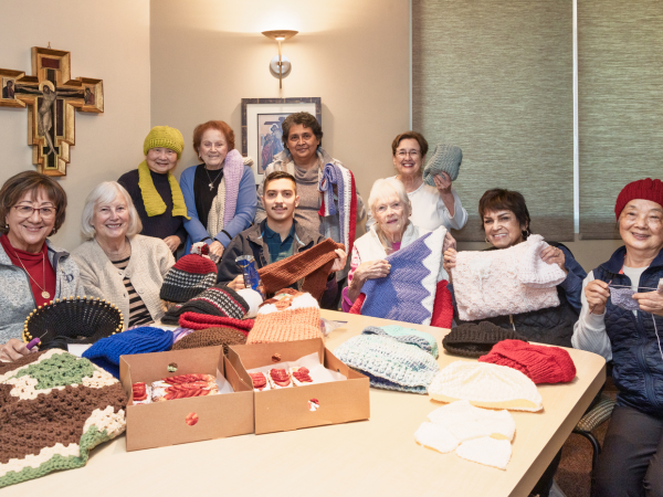 St. Timothy’s founding pastor, Fr. Bruce Lavery, originally asked the women to embrace the ministry, and about 20 women joined the group. For a while, the women not only donated their goods to worthy causes but also raised funds by selling knitted pieces and embroidered items after Mass. Edith Marik, who prefers needlework to knitting, remembers an embroidered tablecloth she made that sold for $460. The money went to the same charities as the caps and scarves, or to help buy more yarn. Marik also sends the group a daily reflection and any prayer intentions for the day.