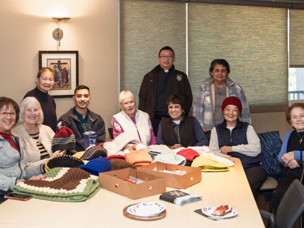 Pastor Fr. Francis Ng stops by to greet members of St. Timothy’s Hat and Scarf Ministry. Photos by Alan Wendell/Diocese of Orange