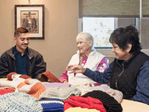 St. Timothy’s parish Hat & Scarf Ministry members Carlos Flores, Judy Daluisiki and Margie Deyo work on their projects during a recent ministry meeting.