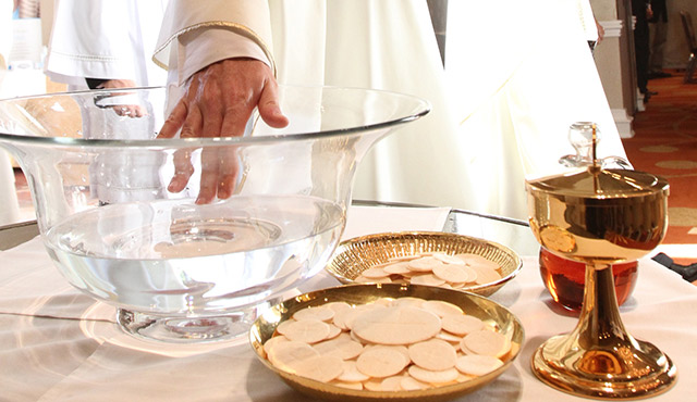 “The notion of blessed water as a physical reminder of baptism goes back quite a ways in the Church,” says Father Gerald, the Episcopal Vicar for Faith Formation for the Diocese of Orange. “We use it in many ways within the celebration of the sacraments. In funerals, we sprinkle the body with water at the beginning of a funeral ceremony, and we bless the rings of marriage with holy water during the wedding ceremony. In all of those it’s meant to be a reminder of the baptismal sacrament.