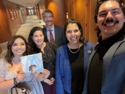 ANNABELLE ELISE HOLDS A COPY OF “THE LAST BEAUTIFUL BABY” DURING A VISIT WITH ORANGE COUNTY CATHOLIC SCHOOLS STAFF, DR. DENISE VALADEZ, DR. BRAD SNYDER AND DR. ERIN BARISANO, ALONG WITH HER WRITING PARTNER, STEVEN SLIWOSKI. PHOTO COURTESY OF ANNABELLE ELISE