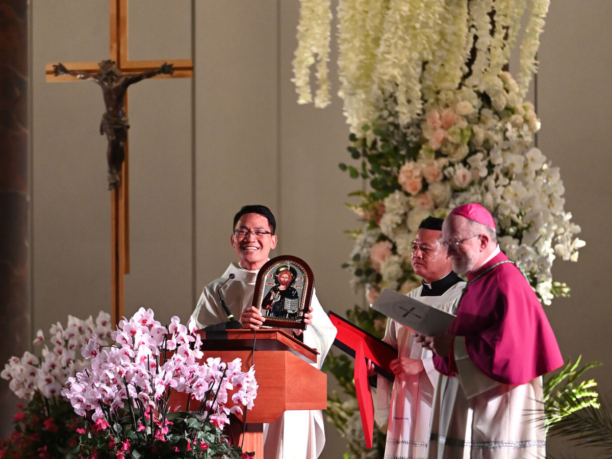 FR. BAO THAI RECEIVES A GIFT FROM BISHOP KEVIN VANN ON HIS FIRST DAY AS RECTOR OF CHRIST CATHEDRAL, FRIDAY JULY 1. PHOTO COURTESY OF STEVEN GEORGES/DIOCESE OF ORANGE