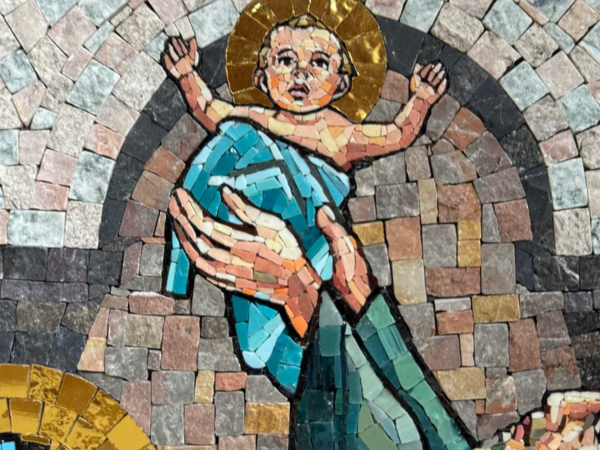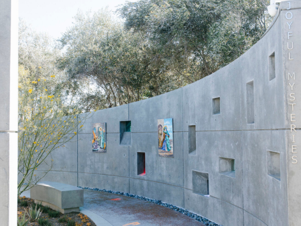 This is the first section of the Marian Gardens, and where visitors will be invited to start their journey. Joyful Mysteries contains five mosaics as well as stained glass embedded into the walls. The pieces of yellow and orange crushed glass in the pathway symbolize the moments of joy and divine revelation of Jesus and the Virgin Mary, which is what this garden’s mysteries are about.