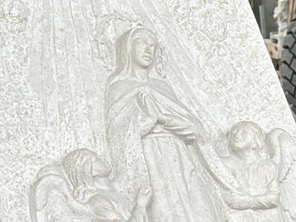 The sacred art in Glorious are five panels made of botticino limestone. These mysteries focus on the triumph of Jesus and the Virgin Mary. They invite believers to reflect on the joyous events following Jesus’ Resurrection and Mary’s Assumption into Heaven.