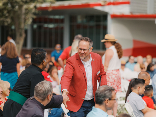 SCOTT MELVIN, VICE PRESIDENT OF SCHOOL RELATIONS AT MATER DEI, GREETS ATTENDEES ON AUG. 17. PHOTOS BY IAN TRAN/DIOCESE OF ORANGE