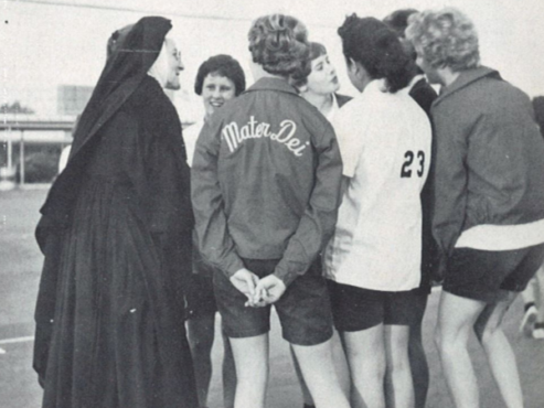 MATER DEI GIRLS VOLLEYBALL PLAYERS DISCUSS GAME STRATEGY IN 1958.