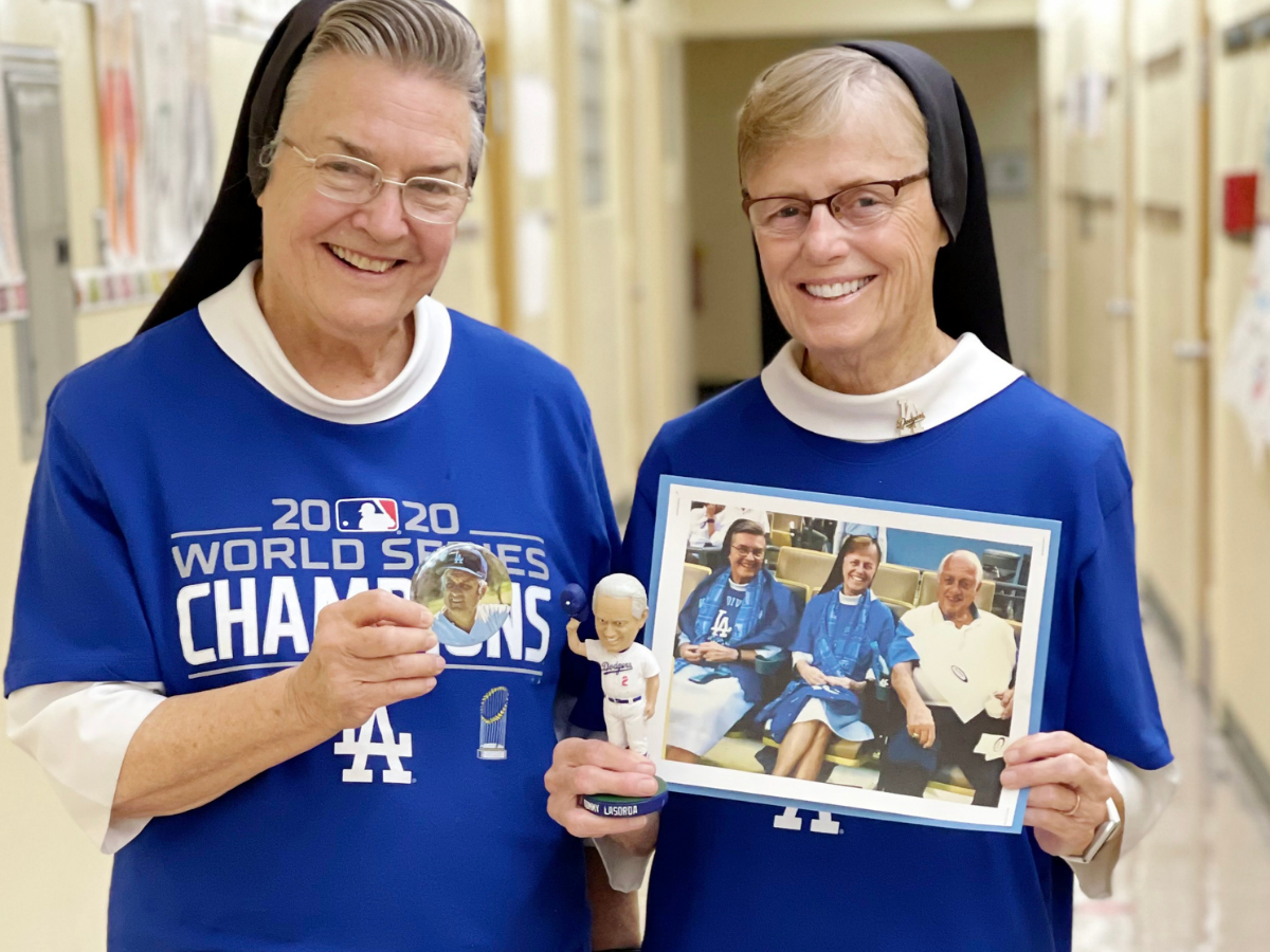 Sister JoAnn Ashburn, OP – SCA eighth grade teacher at Saint Catherine’s Academy in Anaheim and Sister Johnellen Turner, OP – SCA Administrator/Principal, show they are big-time Dodgers fans.