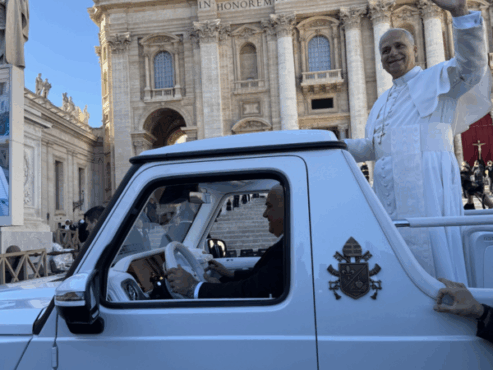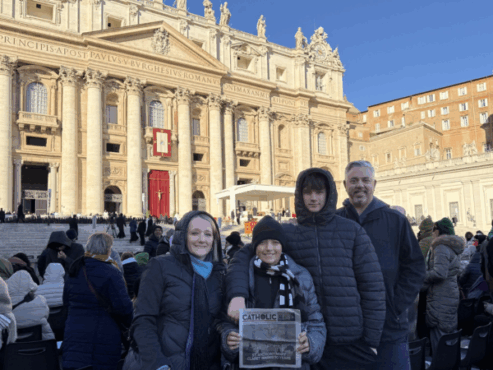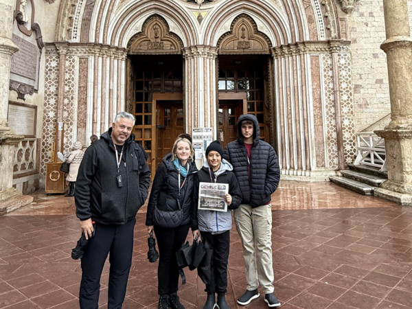 The Fortino Family (Michael, Jaclyn, Nicolas and Lucas) brought the Orange County Catholic along on a Thanksgiving pilgrimage to Italy and France. Their journey took them through Rome, Assisi, Florence, Venice and Paris, where they visited 31 churches, walked through four Holy Doors and honored countless saints and relics. They participated at Mass at the Vatican, St. Mark’s Basilica in Venice and Notre-Dame Cathedral, stood just feet from Pope Leo as he passed by and watched the boys climb both St. Peter’s Basilica and the Holy Stairs (Scala Sancta) on their knees. Pictured are moments from their pilgrimage, including Mass at the Vatican, their encounter with Pope Leo and their visit to the Basilica of St. Francis of Assisi.