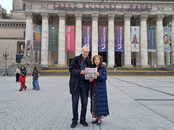 Kevin and Dr. Laura Haynes, along with their copy of the OC Catholic, made their way to Warsaw, Poland, where Laura was invited to speak at two separate mental health professional conferences. In the background is the Palace of Culture and Science, which serves as a reminder of Poland’s Soviet past. Today it houses theatres, museums, a swimming pool, cinemas, libraries, government offices and academic institutions, including the Polish Academy of Sciences.