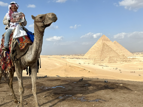 Todd Anh Ha sits atop a camel in front of the Great Giza Pyramid in Cairo, Egypt.