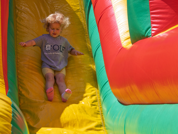 ADRIANA GARCIA RIDES THE INFLATABLE SLIDE AT THE FALCON FESTIVAL. PHOTO BY ALAN WENDELL/DIOCESE OF ORANGE