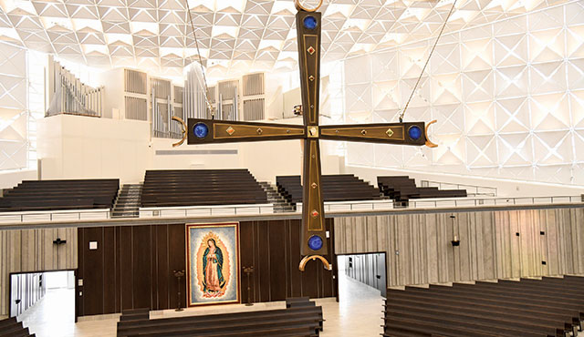 Her importance will be underscored at Christ Cathedral as it will be home to one of the most impressive mosaics of Our Lady of Guadalupe anywhere. The 10-by-7-foot commissioned tile mosaic on the entry wall features more than 55,000 tiles of gold and opaque glass.