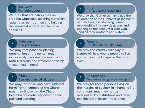 Pope Francis, as head of the Catholic Church and our spiritual father, is aware of our pastoral needs and spiritual well-being. Each year he issues a list of monthly intentions for all of us to unite with him in intercessory prayer. These intentions are focused primarily on the sufferings and challenges of people and groups throughout the world. This list is issued through the Pope’s Worldwide Prayer Network, an organization that promotes regular prayer and promotes the Pope’s intentions. In addition, Pope Francis may issue a secondary missionary intention based on unexpected events and natural disasters which is then communicated by the Worldwide Prayer Network.