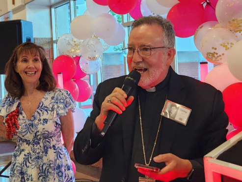 BISHOP JAIME SOTO OF THE DIOCESE OF SACRAMENTO BLESSES HIS FORMER CLASSMATES AT THE START OF THE CLASS OF 1974’S 50TH REUNION HELD JULY 20 AT MATER DEI HIGH SCHOOL. AT LEFT IS CLASS MEMBER LINDA RUIZ, WHO SERVED ON THE REUNION’S ORGANIZING COMMITTEE.