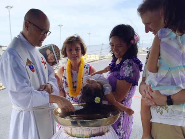 CHAPLAIN CAPT. JOHN SHIMOTSU BAPTIZES AN INFANT IN THE SHIP’S BELL ABOARD. COURTESY PHOTO