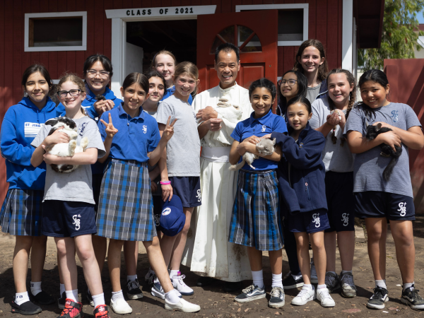 FR. DAMIEN GIAP, SCHOOL RECTOR, LAUGHS WITH ST. JOHN THE BAPTIST STUDENTS WHILE HOLDING MALLOW THE RABBIT. PHOTOS BY DREW KELLEY/DIOCESE OF ORANGE