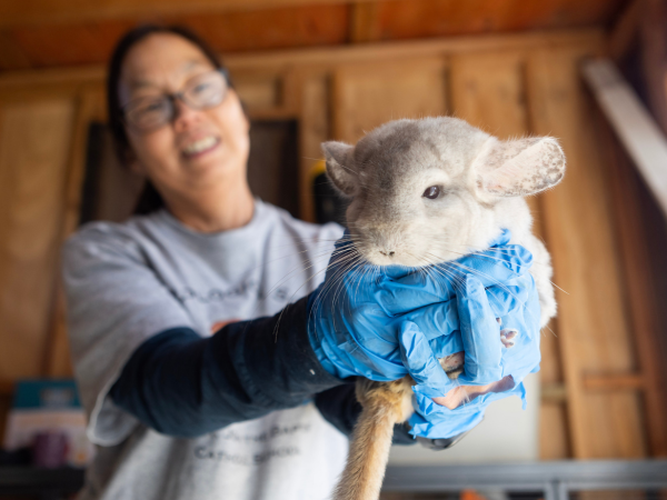 VOLUNTEER “ZOOKEEPER” ANNE MARIE LAU HOLDS UP A CHINCHILLA ON MARCH 31 AT ST. JOHN THE BAPTIST SCHOOL CAMPUS.