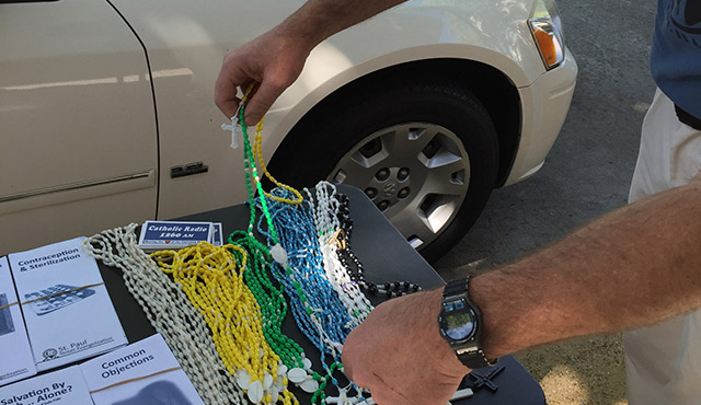 Near that line of waiting pancake aficionados is a table lined with pamphlets with titles such as “Praying to the Saints,” “The Bible Alone?” and “Reasons to Return to the Catholic Church.” Arranged to the right are dozens of rosary beads.