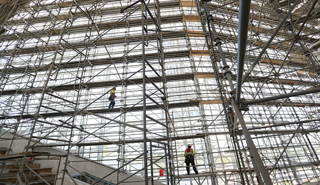 An intricate maze of scaffolding was installed inside the cathedral to allow workers to clean the inside of the more than 11,000 glass windowpanes. It was also used to allow construction crewmembers to paint the nine-story space frame, and to install fire sprinklers, lighting and the quatrefoils.