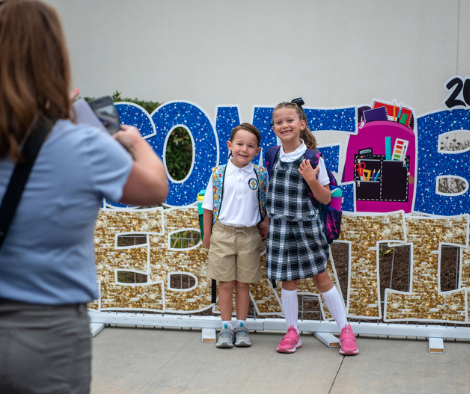 KAITLIN HOLM TAKES A PHOTO OF HER CHILDREN, THOMAS HOLM, A KINDERGARTENER, AND VICTORIA HOLM, A SECOND-GRADER, IN FRONT OF A WELCOME BACK SIGN AT ST. SERRA CATHOLIC SCHOOL IN RANCHO SANTA MARGARITA. PHOTO BY JEFF ANTENORE/DIOCESE OF ORANGE