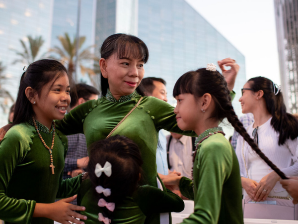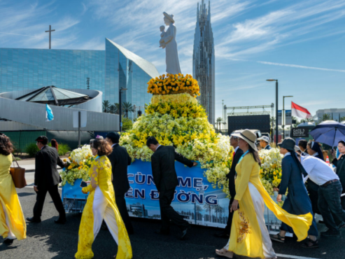The celebration has quickly become the largest of its kind on the West Coast. It is centered around the cathedral’s Our Lady of La Vang Shrine, whose centerpiece is a 16-foot-tall Virgin Mary statue depicting how the Blessed Mother is believed to have appeared before a group of persecuted Vietnamese Catholics in 1798 in a rainforest of Vietnam.