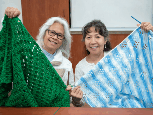 PRAYER SHAWL MINISTRY MEMBERS DITAS SAYTHER, LEFT, AND JENNIFER PHAM HOLD UP THE SHAWLS THEY ARE WORKING ON DURING A MEETING OF THE GROUP AT ST. KILIAN CATHOLIC CHURCH IN MISSION VIEJO ON JAN. 8.