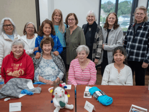MEMBERS OF ST. KILIAN’S PRAYER SHAWL MINISTRY POSE TOGETHER DURING A KNITTING SESSION AT THE MISSION VIEJO CATHOLIC CHURCH ON JAN. 8. PHOTO BY JEFF ANTENORE/DIOCESE OF ORANGE